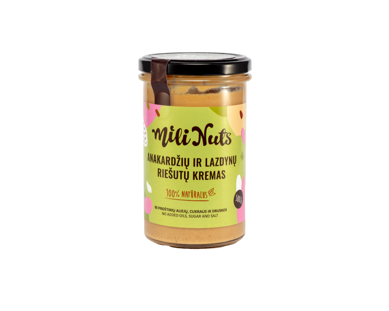 Švelnus, natūralus ir itin aromatingas „MiliNuts“ anakardžių ir lazdynų kremas – dviejų riešutų harmonija viename stiklainyje. Kreminė tekstūra, subtilus anakardžių švelnumas ir išraiškingas lazdynų skonis sukuria gardų derinį be jokių priedų.