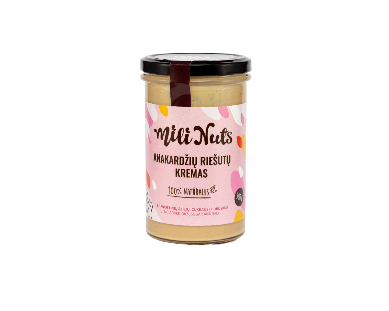 Švelnus, kreminis ir natūraliai salstelėjęs „MiliNuts“ anakardžių kremas – tai tikras desertas be jokios sąžinės graužaties. Pagamintas iš 100 % skrudintų anakardžių, be pridėtinių aliejų, cukraus ar druskos.