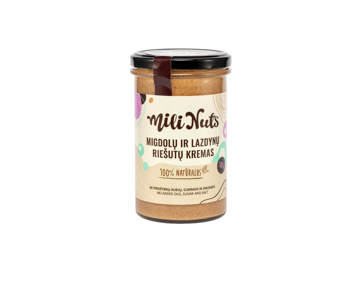 Unikalus skonių duetas – švelnūs migdolai ir aromatingi lazdynai viename stiklainyje! „MiliNuts“ migdolų ir lazdynų kremas pagamintas tik iš 100 % skrudintų riešutų, be pridėtinių aliejų, cukraus ar druskos.