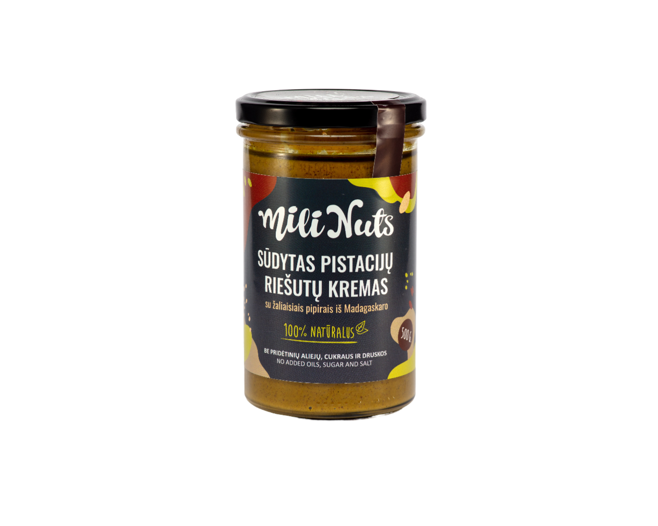 Išskirtinis „MiliNuts“ skonis – vienintelis kremas, kuriame naudojama druska! Pagamintas iš skrudintų pistacijų, praturtintas žaliaisiais Madagaskaro pipirais, kurie suteikia subtilų pikantišką poskonį.