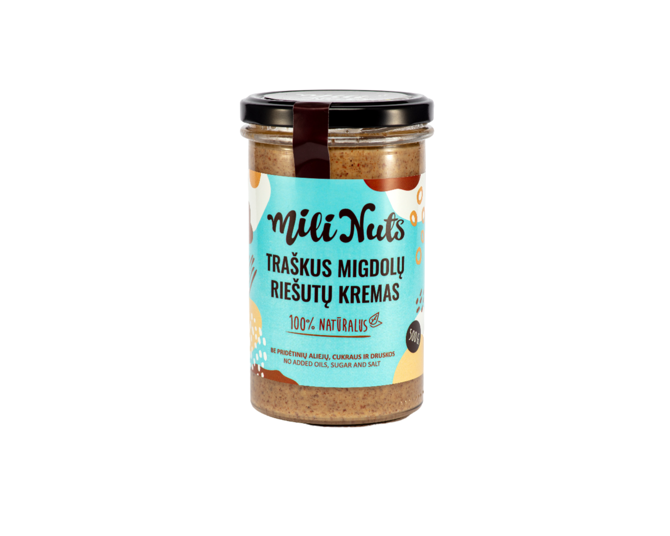 Traškusis „MiliNuts“ variantas – kai norisi daugiau tekstūros ir intensyvesnio skonio. Pagamintas iš 100 % skrudintų migdolų, be jokių priedų. Kreminė masė su migdolų gabaliukais užtikrina malonų traškesį kiekviename kąsnyje.